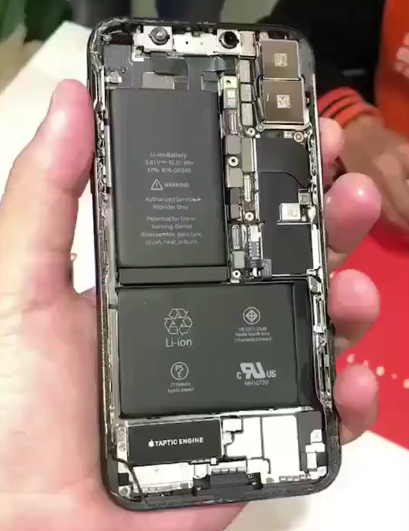 可以看到,內(nèi)部元件整體布局和之前幾代iPhone很相似,但也有明顯的變化,尤其是電池首次配備了兩塊(總?cè)萘?716mAh),為續(xù)航也是拼了,同時也應(yīng)該是為了配合OLED屏幕。