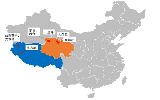 中國鹽湖主要分布在青海和西藏。目前我國擁有 1500 多個鹽湖,主要分布在青海和西藏。其中已開發(fā)碳酸鋰資源的為青海的察爾汗鹽湖、一里坪鹽湖、東臺吉乃爾鹽湖、西臺吉乃爾鹽湖、大柴旦鹽湖,以及西藏的扎布耶鹽湖、西藏阿里地區(qū)的結(jié)則茶卡鹽湖和龍木錯鹽湖。各個鹽湖的儲量不同,其中以察爾汗鹽湖為首,儲量約 718 萬噸碳酸鋰,其次為西藏的扎布耶鹽湖,儲量約 217 萬噸碳酸鋰。