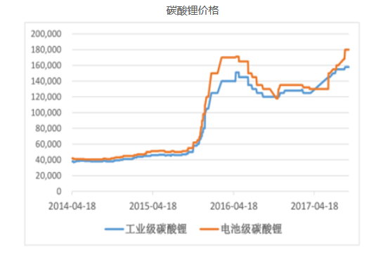 碳酸鋰主要應(yīng)用于陶瓷、玻璃、鋰電池等行業(yè),分為電池級和工業(yè)級碳酸鋰。工業(yè)級碳酸鋰的需求比較穩(wěn)定,每年增長為個位數(shù)。而電池級碳酸鋰占比約為 40%,隨著近幾年新能源汽車的快速增長,電池級碳酸鋰的需求年復(fù)合增長可達50%以上,拉動的了碳酸鋰的價格和需求的整體上漲。而隨著電池級碳酸鋰的需求持續(xù)增加,國內(nèi)碳酸鋰的供需仍存在缺口,隨著鹽湖提鋰的技術(shù)逐步完善,鹽湖提鋰仍將持續(xù)擴產(chǎn),大部分于新增產(chǎn)能將于 2019年至2020年期間建成到達產(chǎn),所以預(yù)計到 2020年國內(nèi)碳酸鋰供需將實現(xiàn)平衡。