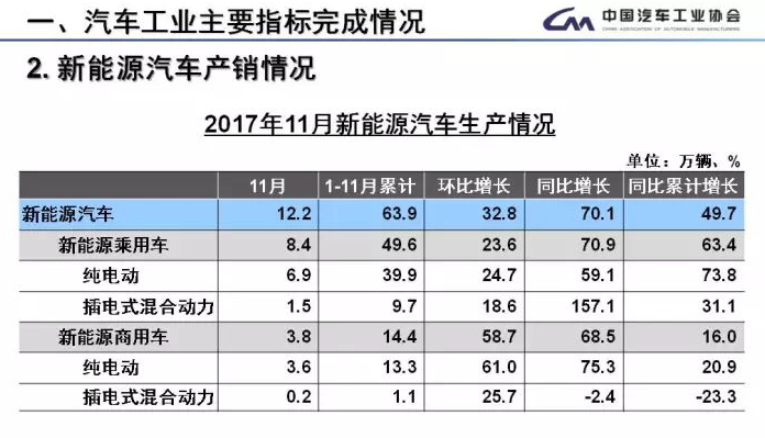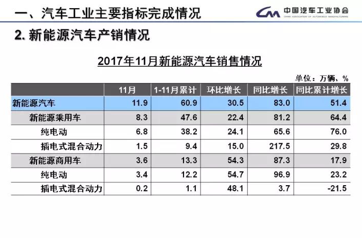 12月11日,中國汽車工業(yè)協(xié)會召開11月份汽車產(chǎn)銷數(shù)據(jù)發(fā)布會。在新能源汽車部分,11月份產(chǎn)銷量分別為12.2萬輛和11.9萬輛 ,同比增長分別為70.1%和83%;2017年前11月累計產(chǎn)銷分別為63.9萬輛和60.9萬輛 ,同比增長分別為49.7%和51.4%。