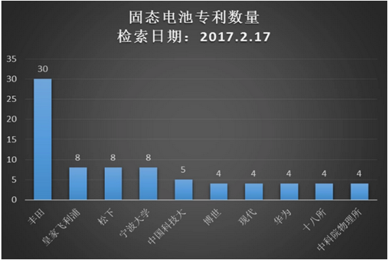 豐田可謂固態(tài)電池最狂熱的信徒。不久前,豐田汽車放出消息稱,豐田配備固態(tài)電池可大幅提升全新電動車的續(xù)航里程,并且縮短充電時間。這款新固態(tài)電池電動汽車預(yù)計將于2022年正式上市。通過對有關(guān)固態(tài)電池的專利數(shù)量比較也不難看出,豐田擁有的固態(tài)電池專利數(shù)量遙遙領(lǐng)先。