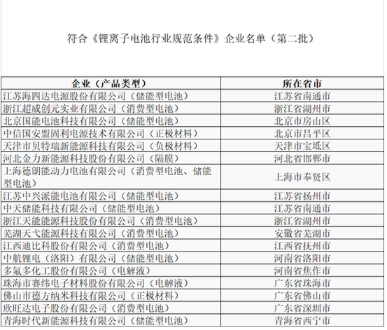 2018年1月15日,國家工信部公布了符合《鋰離子電池行業(yè)規(guī)范條件》企業(yè)名單(第二批),海四達、超威創(chuàng)元、國能、中信國安盟固利、貝特瑞、中航鋰電、欣旺達、德朗能、中天儲能、蕪湖天弋等18家企業(yè)正式入選。