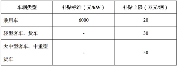 (一)燃料電池汽車補貼標準。燃料電池乘用車按照搭載燃料電池系統(tǒng)的額定功率進行補貼,燃料電池客車、貨車采取定額補貼,具體如下: