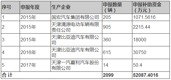 5月9日,天津市工信委公示,天津市新能源汽車生產(chǎn)企業(yè)2017年及以前年度中央財政補助資金清算情況。國宏汽車、清源、比亞迪、一汽夏利4家車企的2099輛新能源汽車,申報國補52087.4016萬元。