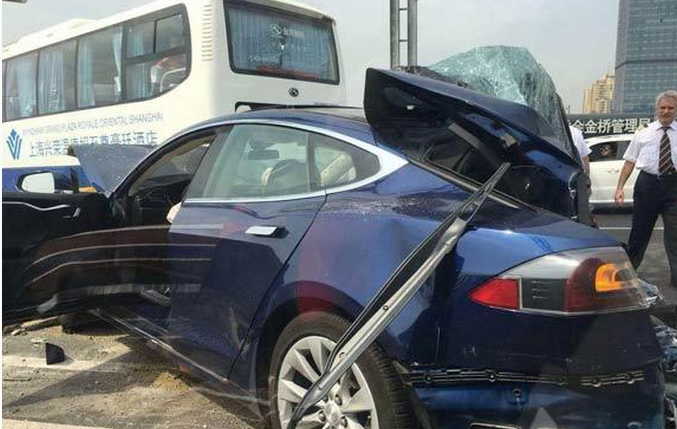 網(wǎng)上流傳的事故現(xiàn)場(chǎng)照片顯示,特斯拉撞在隔離墩上,尾部被撞得嚴(yán)重變形。有目擊者稱(chēng),事故原因或?yàn)樘厮估I車(chē)超速加急變道導(dǎo)致。