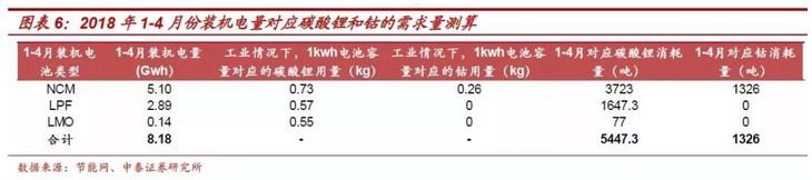測(cè)算結(jié)果,2018年1-4月份裝機(jī)電池消耗碳酸鋰5447.3噸、金屬鈷1326噸。