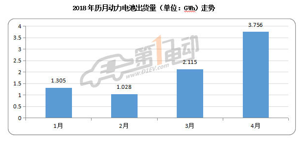 ??? 根據(jù)第一電動研究院的統(tǒng)計測算,2018年4月國內(nèi)新能源汽車市場動力電池裝機量為3.756GWh,比上月大增77.63%,同比增長261.56%。