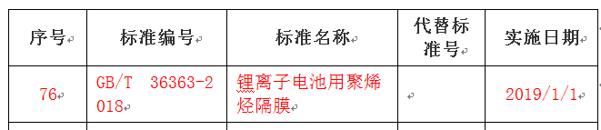 6月7日,國(guó)家市場(chǎng)監(jiān)督管理總局、國(guó)家標(biāo)準(zhǔn)化管理委員會(huì)發(fā)布了《中華人民共和國(guó)國(guó)家標(biāo)準(zhǔn)公告(2018年第9號(hào))》,批準(zhǔn)發(fā)布《工業(yè)硼酸》等393項(xiàng)國(guó)家標(biāo)準(zhǔn)和7項(xiàng)國(guó)家標(biāo)準(zhǔn)外文版。其中,包括由全國(guó)堿性蓄電池標(biāo)準(zhǔn)化技術(shù)委員會(huì)(SAC/TC77)歸口,全國(guó)堿性蓄電池標(biāo)準(zhǔn)化技術(shù)委員會(huì)和中國(guó)化學(xué)與物理電源行業(yè)協(xié)會(huì)組織相關(guān)企業(yè)制定的《鋰離子電池用聚烯烴隔膜》國(guó)家標(biāo)準(zhǔn)(標(biāo)準(zhǔn)編號(hào):GB/T 36363-2018),該標(biāo)準(zhǔn)將于2019年1月1日施行。