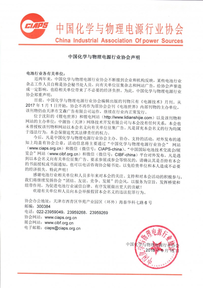 今后,凡是中國化學與物理電源行業(yè)協會主辦、協辦、支持的活動,對外發(fā)布的通知上均蓋有協會公章,活動信息將主要通過“中國化學與物理電源行業(yè)協會” 網站(m.heimacaiwu.com)和微信(微信號:CIAPS-china)、“中國國際電池技術交流會/展覽會”網站(www.cibf.org.cn)和微信(微信號:CIBF-china)平臺對外發(fā)布。凡是遇到以本會名義向有關單位征集廣告、要求參展或參會等情況的,請確認其是否持有本會的書面授權或書面通知,也可以電話咨詢協會秘書處,以免給貴單位和本人造成不必要的經濟損失。特此聲明!