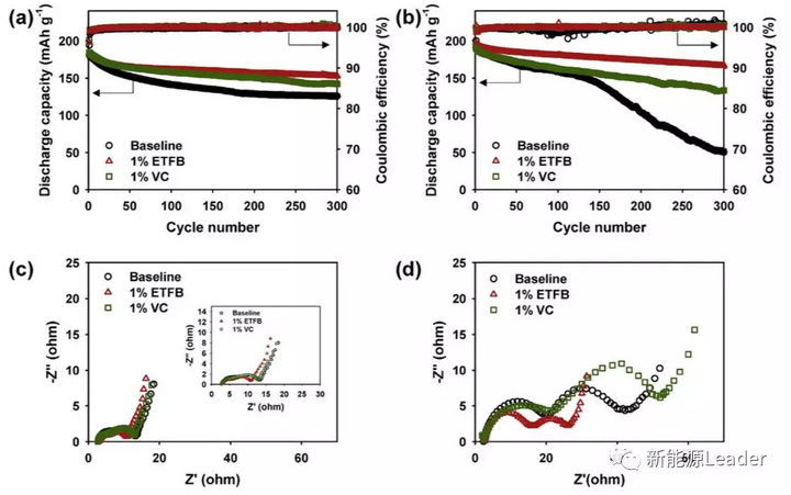 下圖為不同電解液在25℃和45℃下的循環(huán)性能對比(0.5C充放),從圖中能夠看到在25℃常溫下空白對照電解液的衰降速度非???,而采用VC添加劑和ETFB添加的電池的循環(huán)性能比較接近,僅僅是在循環(huán)的后期VC添加劑電解液出現(xiàn)了衰降較快的現(xiàn)象。在高溫下幾種電解液的差距就比較明顯了,從下圖b中能夠看到從一開始ETFB添加劑的電解液就表現(xiàn)出了絕對的優(yōu)勢,采用VC和空白電解液在循環(huán)過程中衰降非常迅速,特別是空白對照組電解液在循環(huán)150次以后出現(xiàn)了容量跳水的現(xiàn)象。通過EIS分析發(fā)現(xiàn),通過在空白電解液中加入1%的ETFB添加劑能夠將電池在45℃下循環(huán)300次后的界面阻抗(包括SEI膜阻抗和電荷交換阻抗)從39ohm降低到22.8ohm,表明ETFB能夠形成更加穩(wěn)定和低阻抗的SEI膜。