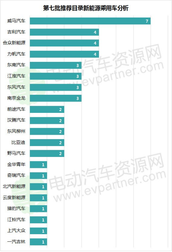經(jīng)電動(dòng)汽車資源網(wǎng)統(tǒng)計(jì),入選第7批推薦目錄的49款新能源乘用車來自21家車企。其中威馬汽車入圍新能源乘用車車型數(shù)最多,達(dá)到了7款;其次分別是:威馬汽車(7)、力帆汽車(4)、合眾新能源(4)、吉利汽車(4)、南京金龍(3)、東風(fēng)汽車(3)、江淮汽車(3)、東南汽車(3)、野馬汽車(2)、比亞迪(2)、東風(fēng)柳州(2)、漢騰汽車(2)、前途汽車(2)、一汽吉林(1)、上汽大眾(1)、江鈴汽車(1)、獵豹汽車(1)、云度新能源(1)、北汽新能源(1)、奇瑞汽車(1)、金華青年(1)。