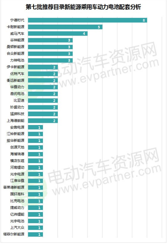 動(dòng)力電池配套方面,經(jīng)電動(dòng)汽車資源網(wǎng)統(tǒng)計(jì),此次推薦目錄的49款新能源乘用車由33家動(dòng)力電池企業(yè)(含組合)提供配套,分別為:寧德時(shí)代(8)、卡耐新能源(5)、威馬汽車(4)、力神電池(3)、合眾新能源(3)、桑頓新能源(3)、谷神能源(3)、上海德朗能(2)、猛獅科技(2)、妙盛動(dòng)力(2)、比亞迪(2)、遨優(yōu)電池(2)、華霆?jiǎng)恿Γ?)、衡遠(yuǎn)新能源(2)、優(yōu)特汽車(2)、伊卡新能源(2)、塔菲爾新能源(1)、上汽大眾(1)、光宇電池(1)、億緯鋰能(1)、捷威動(dòng)力(1)、比克電池(1)、國(guó)軒高科(1)、普萊德新能源(1)、江淮華霆(1)、光宇電源(1)、河南鋰動(dòng)(1)、橫店?yáng)|磁(1)、海博瑞德(1)、創(chuàng)源天地(1)、振華新能源(1)、江鈴新能源(1)、安靠電源(1)。