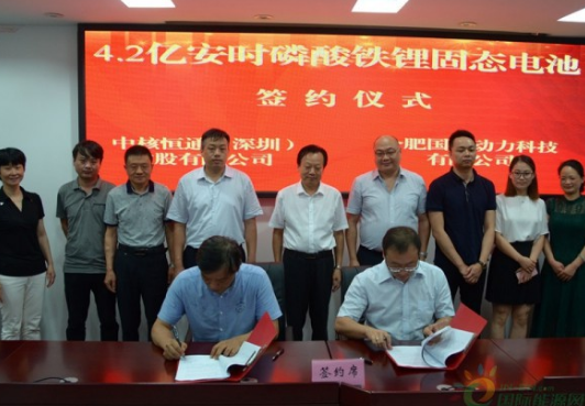 7月10日,中核恒通(深圳)控股有限公司與合肥國能動力科技有限公司(以下簡稱“合肥國能動力”)在安徽廬江縣高新區(qū)舉行4.2億安時磷酸鐵鋰固態(tài)電池簽約儀式??h人大常委會副主任熊杰、高新區(qū)管委會主任李朝傳等出席簽約儀式。