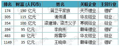 受益于新能源汽車和動(dòng)力電池產(chǎn)業(yè)的蓬勃發(fā)展,上游鋰、鈷原料產(chǎn)業(yè)近年來迎來了發(fā)展的黃金機(jī)遇期。其中,天齊鋰業(yè)的蔣衛(wèi)平家族以190億元身價(jià)在“胡潤(rùn)百富榜”排名174位,位居動(dòng)力電池上游原料行業(yè)第一位;此外,華友鈷業(yè)、寒銳鈷業(yè)、贛鋒鋰業(yè)等上游原料上市公司的相關(guān)人員也榮登榜單。