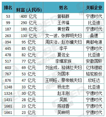2018年胡潤(rùn)百富榜--動(dòng)力電池企業(yè)