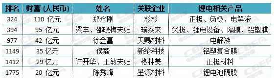 2018年胡潤(rùn)百富榜--動(dòng)力電池上游鋰電裝備