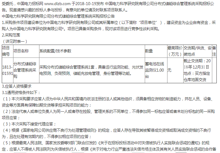 招標(biāo): 中電科院 分布式儲(chǔ)能綜合管理系統(tǒng)采購(gòu)招標(biāo)公告