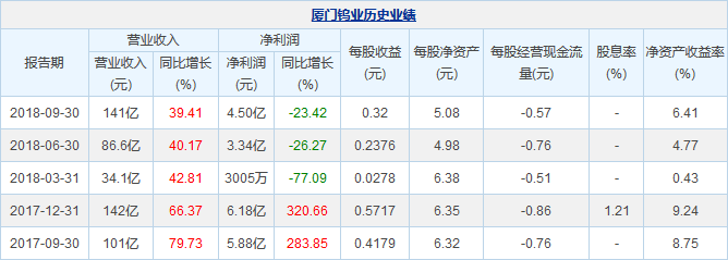 廈門鎢業(yè)10月23日最新公布的2018年三季報顯示,前三季度營業(yè)收入141億元,同比增長39.41%;歸屬于上市公司股東的凈利潤4.50億元,同比下降23.42%。基本每股收益0.32元。