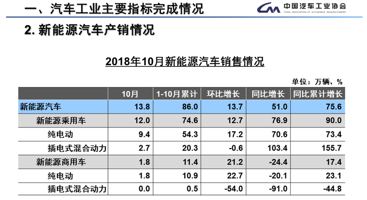 11月9日,中汽協(xié)發(fā)布2018年10月份汽車產(chǎn)銷數(shù)據(jù)。新能源汽車部分,10月份產(chǎn)銷量分別為14.6萬(wàn)輛和13.8萬(wàn)輛,同比增長(zhǎng)分別為58.1%和51%。