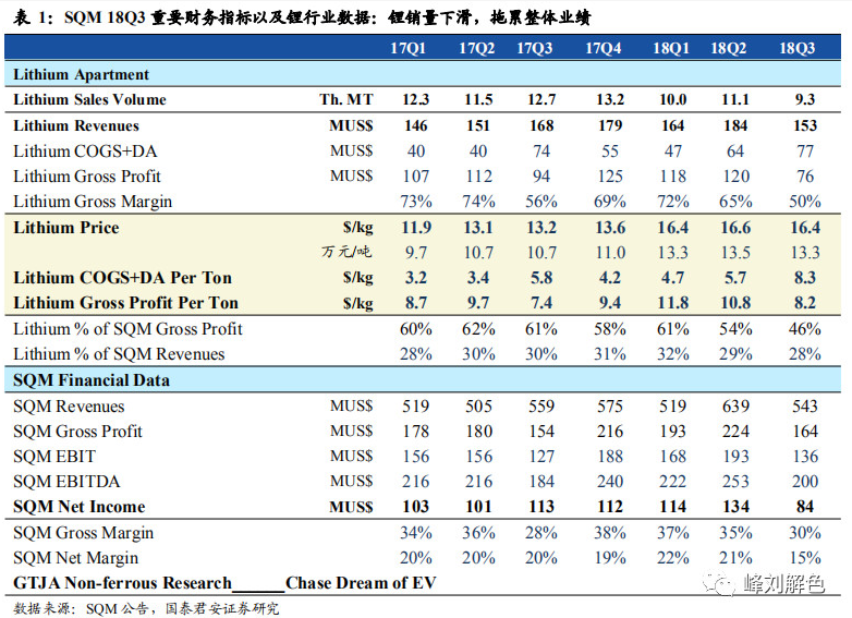 鋰鹽產(chǎn)銷下滑,拖累整體業(yè)績(jī)。①鋰板塊業(yè)績(jī)方面:18Q3單季度鋰板塊實(shí)現(xiàn)營(yíng)業(yè)收入1.5億美元(環(huán)比-17%),占比SQM總營(yíng)收28%(環(huán)比減少1pct),鋰板塊毛利潤(rùn)7600萬美元(環(huán)比-37%),占比SQM總毛利潤(rùn)46%(環(huán)比減少8pct)。②鋰產(chǎn)品銷量方面:Q3鋰產(chǎn)品銷量?jī)H為9300噸,環(huán)比Q2下滑16%,為近2年來首次低于單季度1萬噸的銷量,主要原因系鹽湖擴(kuò)產(chǎn)工程的延誤影響鋰鹽正常生產(chǎn)以及低庫存造成, SQM規(guī)劃2018全年鋰鹽銷售量指引為45000噸,即18Q4需要銷售14600噸鋰鹽,預(yù)示Q4鋰產(chǎn)品產(chǎn)銷量逐步恢復(fù);③鋰產(chǎn)品價(jià)格方面:18Q3鋰產(chǎn)品均價(jià)16.4美元/千克,基本和Q2持平,維持強(qiáng)勁,大幅高于國內(nèi)鋰鹽價(jià)格;④鋰產(chǎn)品盈利能力方面:我們發(fā)現(xiàn)18Q3鋰產(chǎn)品單噸成本(生產(chǎn)成本+折舊攤銷)高達(dá)8.3美元/千克,環(huán)比Q2大幅上升44%,鋰鹽盈利能力出現(xiàn)下滑,我們認(rèn)為主要原因?yàn)辂}湖鋰規(guī)模效應(yīng)很強(qiáng),Q3產(chǎn)銷量低于正常水平,使得單噸鋰鹽分?jǐn)偟墓潭ㄙM(fèi)用大幅提升,預(yù)計(jì)在Q4會(huì)恢復(fù)之前正常水平。