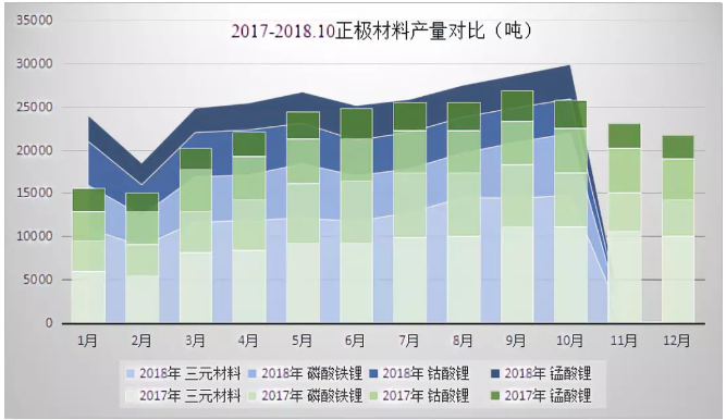截止到2018年10月,國內(nèi)正極材料產(chǎn)量累計(jì)達(dá)到25.6萬噸,相較于去年同期增長了13.3%,預(yù)計(jì)全年增速在15%左右。增長主要來源于三元材料,磷酸鐵鋰和鈷酸鋰拖了些后腿。