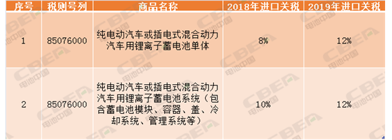 2018年與2019年動(dòng)力電池進(jìn)口關(guān)稅調(diào)整對(duì)比