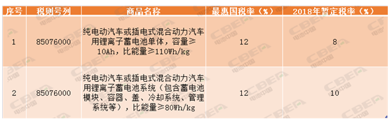 2018年新能源汽車(chē)用鋰離子電池進(jìn)口暫定稅率整理