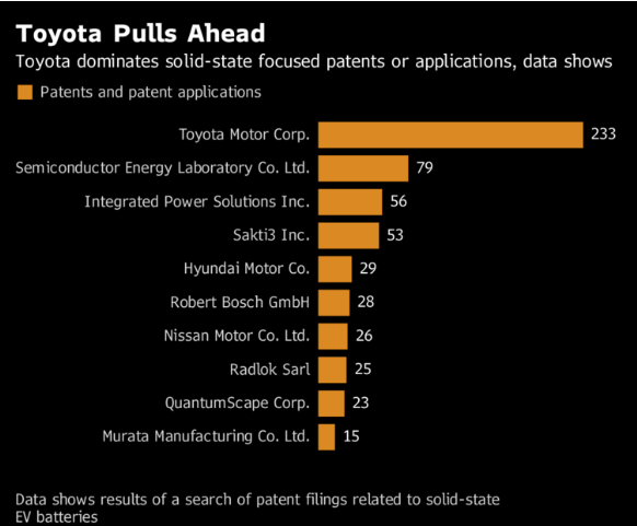 根據(jù)彭博社的Tommy Shen分析,亞洲最大的汽車制造商至少擁有233項(xiàng)關(guān)于該技術(shù)的專利或申請(qǐng) - 幾乎是其最接近競(jìng)爭(zhēng)對(duì)手?jǐn)?shù)量的三倍。該公司計(jì)劃在其電池業(yè)務(wù)上投資1.5萬億日元(139億美元),并計(jì)劃在20世紀(jì)20年代初將固態(tài)技術(shù)商業(yè)化,根據(jù)其10月發(fā)布的年度報(bào)告。
