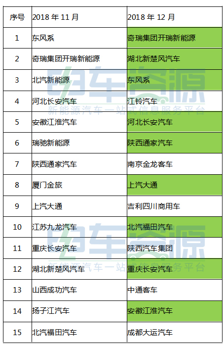 電車資源通過(guò)對(duì)比2018年11月與12月新能源專用車產(chǎn)量前15名的企業(yè)名單發(fā)現(xiàn),12月企業(yè)新能源專用車產(chǎn)量出現(xiàn)分化。在11月新能源專用車產(chǎn)量前15名的企業(yè)中,12月只有9家仍然在前15之列,包括開瑞新能源、湖北新楚風(fēng)汽車、東風(fēng)系、河北長(zhǎng)安汽車、陜西通家汽車、上汽大通、北汽福田、重慶長(zhǎng)安汽車、安徽江淮汽車。