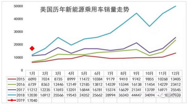 近日,乘聯(lián)會(huì)發(fā)布數(shù)據(jù)顯示,2019年1月美國(guó)新能源銷售1.7萬輛,同比增長(zhǎng)45%,其中純電動(dòng)車型銷售10620輛,插電式混合動(dòng)力車型銷售6420輛。事實(shí)上,近年來美國(guó)新能源車銷量數(shù)據(jù)總體走勢(shì)較好,尤其是去年7月以來持續(xù)高增長(zhǎng),但結(jié)構(gòu)性分化特征較明顯,剔除明星車型Model 3后的增速相對(duì)一般。