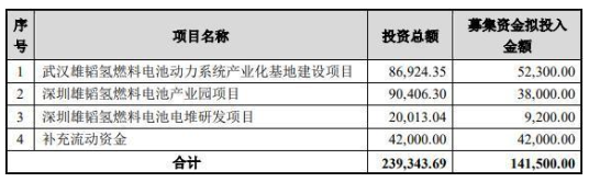 其中,武漢雄韜氫燃料電池動(dòng)力系統(tǒng)產(chǎn)業(yè)化基地建設(shè)項(xiàng)目的實(shí)施單位是武漢雄韜氫雄燃料電池科技有限公司,項(xiàng)目地點(diǎn)將位于武漢經(jīng)濟(jì)技術(shù)開(kāi)發(fā)區(qū)。該項(xiàng)目預(yù)計(jì)投資總額為86,924.35萬(wàn)元,工程費(fèi)用68,342.26萬(wàn)元(擬使用本次募集資金52,300.00萬(wàn)元)。