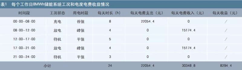 我國對(duì)一般工商業(yè)用戶只收取電度電費(fèi),收益來源只來自于電價(jià)差的電度電費(fèi)收益。以北京市地區(qū)執(zhí)行的郊區(qū)非居民一般工商業(yè)20千伏用電電度電價(jià)作為基礎(chǔ),即谷值充電電價(jià)為0.3488元/KWh,峰值時(shí)段放電電價(jià)為1.3612元/KWh。每年按320個(gè)工作日,每天24h工作循環(huán)作為系統(tǒng)工況,測得每個(gè)工作日充電電費(fèi)約為0.11萬元,放電收益電費(fèi)約為0.44萬元,則每個(gè)工作日電價(jià)差收益約為0.32萬元,則系統(tǒng)年收益為102.4萬元。每個(gè)工作日儲(chǔ)能系統(tǒng)工況和充放電收益情況如表2所示。
