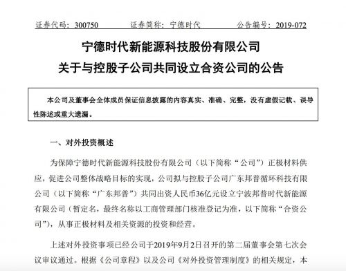 9月3日消息,寧德時代發(fā)布公告稱,公司擬與控股子公司廣東邦普循環(huán)科技有限公司(以下簡稱“廣東邦普”)共同出資人民幣36億元設立寧波邦普時代新能源有限公司,從事正極材料及相關資源的投資和經(jīng)營。