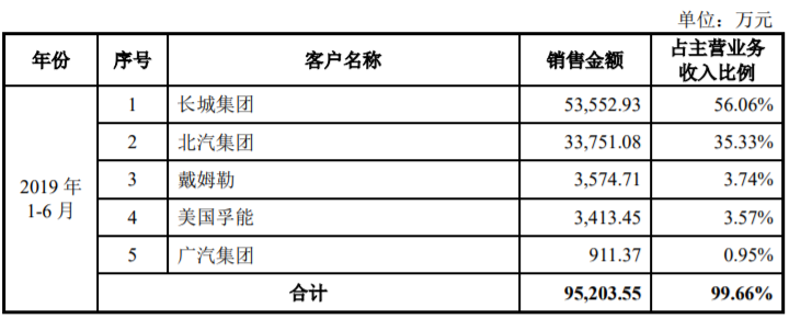 可以說(shuō),孚能科技2016年至2018年的第一大客戶當(dāng)屬北汽集團(tuán),2016年、2017年、2018年和2019年1-6月對(duì)其銷售收入占主營(yíng)業(yè)務(wù)收入比重分別為65.63%、87.57%、83.58%和 35.33%,到了2019年上半年,第一大客戶則變?yōu)殚L(zhǎng)城集團(tuán),其銷售收入占主營(yíng)業(yè)務(wù)收入比重為56.06%。由此可見,孚能科技的客戶集中度相對(duì)較高,主要是目前產(chǎn)能規(guī)模有限所導(dǎo)致。