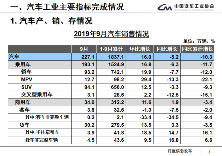 2019年1-9月累計(jì)來(lái)看,汽車(chē)產(chǎn)銷(xiāo)分別完成1814.9萬(wàn)輛和1837.1萬(wàn)輛,產(chǎn)銷(xiāo)量比上年同期分別下降11.4%和10.3%,產(chǎn)銷(xiāo)量降幅比1-8月繼續(xù)收窄。