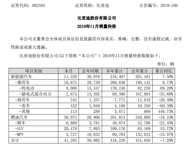 12月6日晚間,比亞迪(002594)發(fā)布11月銷量快報(bào)顯示,今年11月,比亞迪銷售4.1萬(wàn)輛汽車,同比下滑19%。銷量下滑主要是由于比亞迪新能源汽車銷量不及預(yù)期。