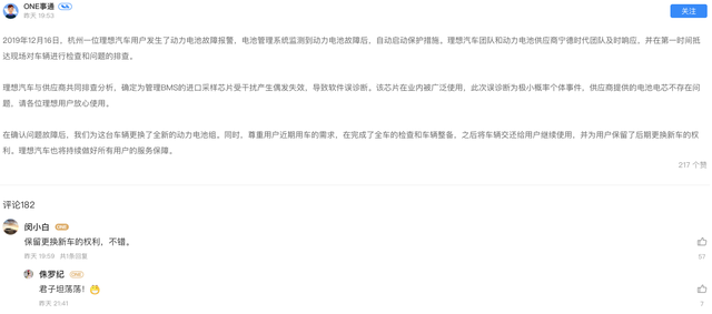 理想汽車表示,與供應(yīng)商共同排查分析后,確定為管理BMS的進(jìn)口采樣芯片受干擾產(chǎn)生偶發(fā)失效,導(dǎo)致軟件誤診斷。該芯片在業(yè)內(nèi)被廣泛使用,此次誤診斷為極小概率個(gè)體事件,供應(yīng)商提供的電池電芯不存在問題。此外,理想汽車稱為該故障車輛更換了全新的動(dòng)力電池組。同時(shí)承諾為用戶保留后期更換新車的權(quán)利。