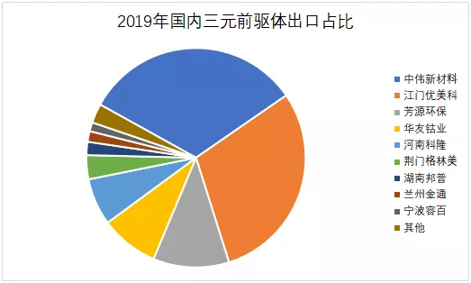 中國(guó)是全球三元前驅(qū)體的重要生產(chǎn)基地,據(jù)鑫欏資訊的統(tǒng)計(jì)數(shù)據(jù)顯示,2019年,國(guó)內(nèi)三元前驅(qū)體總產(chǎn)量約為27.8萬(wàn)噸,其中三元前驅(qū)體出口量為7.65萬(wàn)噸,占國(guó)內(nèi)三元前驅(qū)體總產(chǎn)量的27.5%。如果算上部分二元前驅(qū)體材料,那么出口占比會(huì)超過(guò)30%。