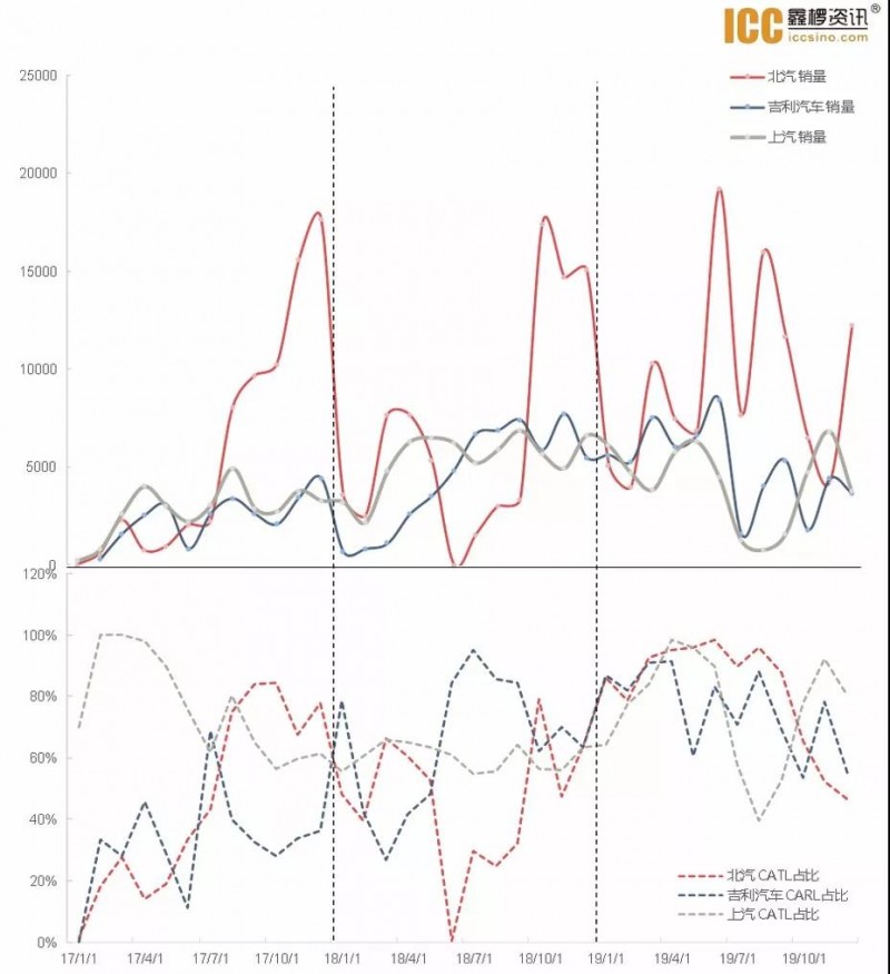 近三年內(nèi)銷量前三始終在北汽、吉利汽車、上汽三家,三家占比總和保持在35%上下,總量呈逐年上升趨勢,寧德時代與北汽、上汽的合作品牌占比在19年有所提升,吉利汽車則從76.51%下降至70.62%。合資品牌如華晨寶馬、上汽大眾、一汽大眾品牌占有率幾乎為100%,其他合資品牌裝機(jī)量19年也表現(xiàn)出上升趨勢,整體產(chǎn)業(yè)結(jié)構(gòu)日趨健康。