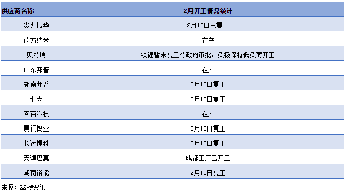 現(xiàn)階段受疫情影響,動力電池企業(yè)開工推遲,據(jù)鑫欏資訊了解,寧德時代青海工廠2月10號已復(fù)工,原料采購也與10號開始著手,其原料供應(yīng)商容百科技、邦普和德方納米開工正常,基本于2月10日陸續(xù)復(fù)產(chǎn)復(fù)工。