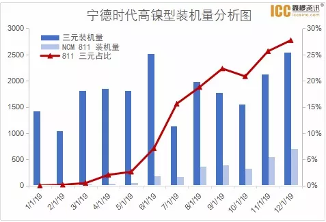 寧德時代811進(jìn)度有望領(lǐng)先LG化學(xué)和三星SDI。LG化學(xué)采用NCM622,NCM811體系目前試用于電動巴士上,大規(guī)模量產(chǎn)時間未定;三星SDI采用NCM622,公司預(yù)計NCM811量產(chǎn)進(jìn)度在2020年后。自2019年2月起,寧德時代開始安裝811型動力電池,到12月811型占比以由年初0.14%上升至27.72%,19年811型總裝機(jī)量占國內(nèi)高鎳總裝機(jī)量的60%。