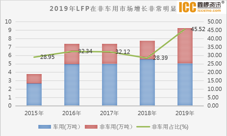 根據(jù)鑫欏資訊統(tǒng)計(jì),2019年磷酸鐵鋰材料產(chǎn)量9.27萬(wàn)噸,其中車用市場(chǎng)消耗僅5萬(wàn)噸,同比少消耗0.5萬(wàn)噸,而非車用市場(chǎng)用量則達(dá)到4.27萬(wàn)噸,份額大幅提升至45.52%,變化明顯。