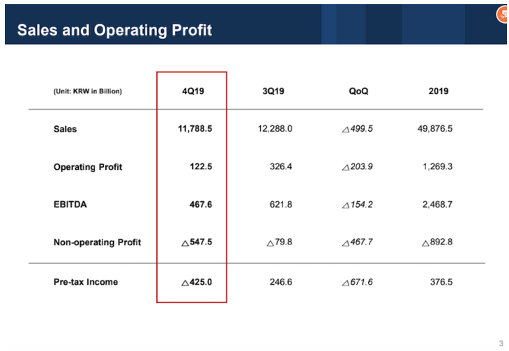 2020年1月31日,SKI發(fā)布了2019年Q4財(cái)報(bào),2019年,SKI營業(yè)收入為49.9萬億韓元(約合2875.4億元人民幣),同比下滑8%;營業(yè)利潤1.3萬億韓元(約合73.2億元人民幣),同比下滑39.6%;凈利潤658億韓元(約合人民幣3.8億元),同比下滑96.1%。