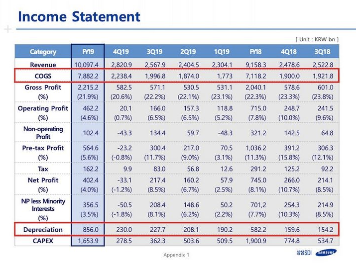 從財(cái)報(bào)中分析,三星SDI在2019年減少的成本主要支出在了總營業(yè)成本與折舊費(fèi)兩個(gè)方面。其中,三星SDI 2019年總營業(yè)成本為7.9萬億韓元(約合人民幣460.5億元),同比增長10.7%;折舊費(fèi)為8560億韓元(約合人民幣49.9億元),同比增長47%。