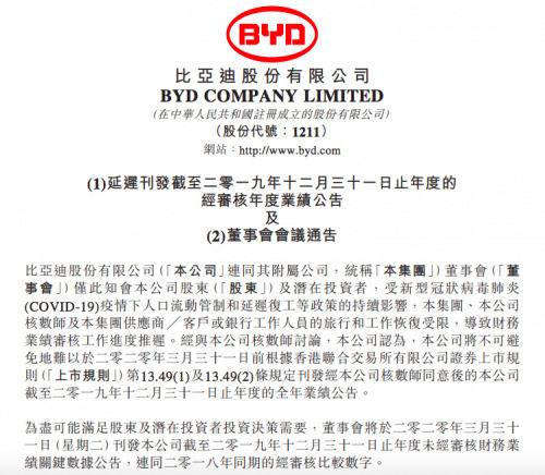 比亞迪表示,董事會(huì)將于3月31日刊發(fā)2019年度未經(jīng)審核財(cái)務(wù)業(yè)績(jī)關(guān)鍵數(shù)據(jù)公 告,連同2018年同期的經(jīng)審核比較數(shù)字。
