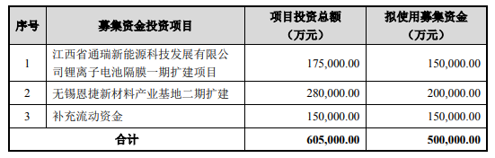 恩捷股份23日晚公告,擬定增募資不超過50億元,擴產(chǎn)鋰電池隔膜、新材料業(yè)務(wù)。公告稱,本次擬募集資金總額不超過50億元,扣除發(fā)行費用后,15億元用于江西省通瑞新能源科技發(fā)展有限公司鋰離子電池隔膜一期擴建項目(下稱“江西項目”),20億元用于無錫恩捷新材料產(chǎn)業(yè)基地二期擴建(下稱“無錫項目”),15億元用于補充流動資金。
