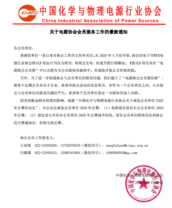 因受到新冠肺炎疫情的影響,根據(jù)“中國化學與物理電源行業(yè)協(xié)會關(guān)于減免會員單位2020年會費的決定”,本會決定減免會員單位2020年會費:(1)免除湖北省的本會會員單位2020年會費;(2)湖北省以外的各會員單位2020年會費減半收取。請各會員單位聯(lián)絡(luò)員收到協(xié)會的交費通知后,積極交納會費。