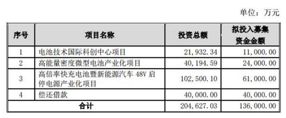 三個項目分別為電池技術國際科創(chuàng)中心項目、高能量密度微型電池產業(yè)化項目、高倍率快充電池暨新能源汽車48V啟停電源產業(yè)化項目,分別投入募集資金1.1億、2.4億、6.1億元,剩余4億用來償還借款。加上募集資金,在這四方面,公司預計總投入為20.46億元。