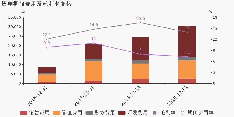 公司2019年?duì)I業(yè)成本36億,同比增長(zhǎng)42.1%,高于營(yíng)業(yè)收入37.8%的增速,導(dǎo)致毛利率下降2.6%。期間費(fèi)用率為7.3%,較去年下降0.7個(gè)百分點(diǎn)。經(jīng)營(yíng)性現(xiàn)金流由-5.4億增加至1.2億,同比上升121.6%。