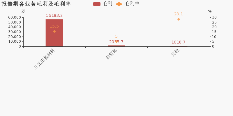 從業(yè)務(wù)結(jié)構(gòu)來(lái)看,“三元正極材料”是企業(yè)營(yíng)業(yè)收入的主要來(lái)源。具體而言,“三元正極材料”營(yíng)業(yè)收入為36.2億,營(yíng)收占比為89%,毛利率為15.5%。